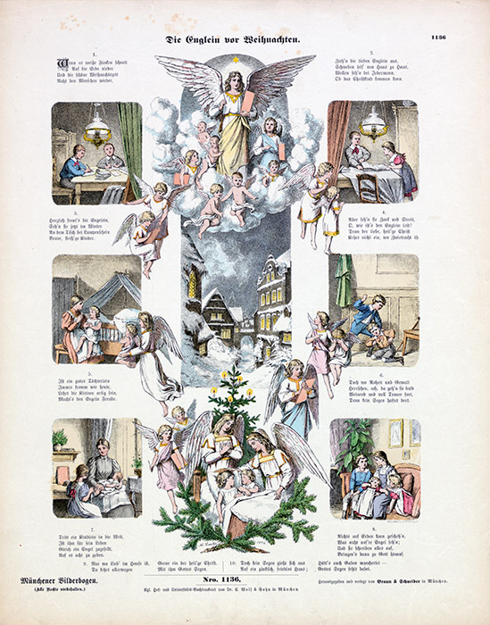 Der Bogen zeigt in spätromantischer Manier, welche Aufgaben die Engel vor dem Weihnachtsfest wahrnehmen: Die Englein schauen wie durch Fenster in kleine Bildchen hinein, um die Kinder zu beobachten. Artiges Verhalten, Fleiß und Geschwisterliebe werden gerne gesehen. Streit, Zwietracht und Gewalt bringen jedoch die Engel zum Weinen. Löbliches wie schimpfliches Verhalten wird fein säuberlich notiert. In zehn Vierzeilern werden die Kinder belehrt, dass der Heilige Christ mit seinem Segen am Heiligen Abend nur in ein friedvolles Haus zu braven Kindern einkehren kann.