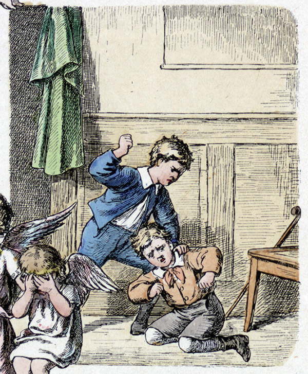 Das Treiben der Kinder rahmt in sechs kleinen Darstellungen einen Bildstreifen in der Mitte: Oben steigt ein geflügeltes, engelsgleiches Christkind mit Schreibstift und Mappe inmitten einer Schar Engel vom Himmel herab. Am Ende des mittleren Bildstreifens liegen zwei Kinder im Bett, das vor einem Christbaum steht. Über ihren Schlaf wachen zwei Engel.