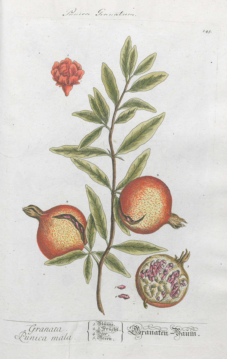 Granata Punica mala. Granaten-Baum. In: Elizabeth Blackwell: Vermehrtes und verbessertes Blackwellisches Kräuterbuch. Herbarium Blackwellianum emendatum et auctum. Nürnberg 1754-1773. Bd. 2. Tab. 145.