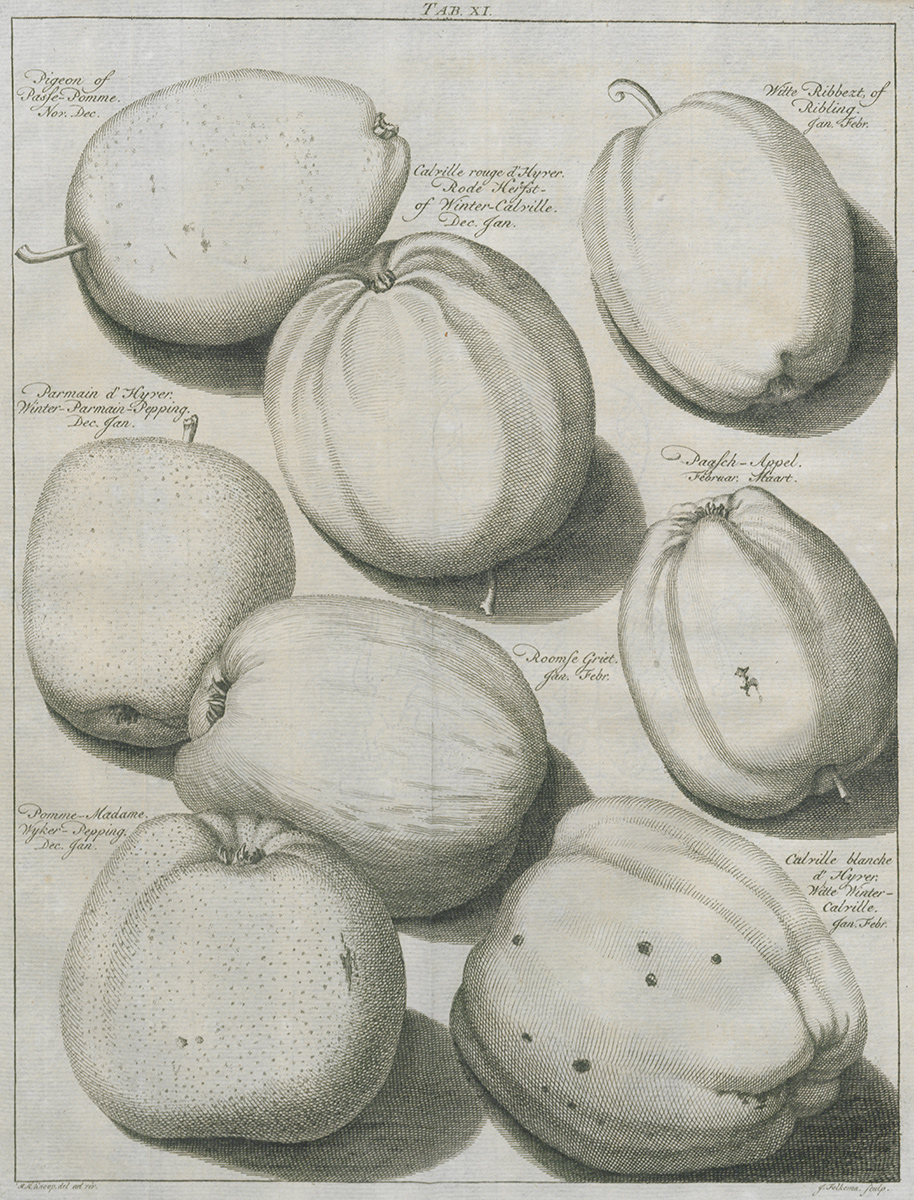 Johann Hermann Knoop: Pomologie, Ou Description Des Meilleures Sortes De Pommes Et De Poires, Que l'on estime & cultive le plus, soit aux Pais-Bas, soit en Allemagne, en France, en Angleterre, etc. Amsterdam 1771. Tab. 11. Dauerleihgabe Regensburgische Botanische Gesellschaft. Universitätsbibliothek Regensburg.