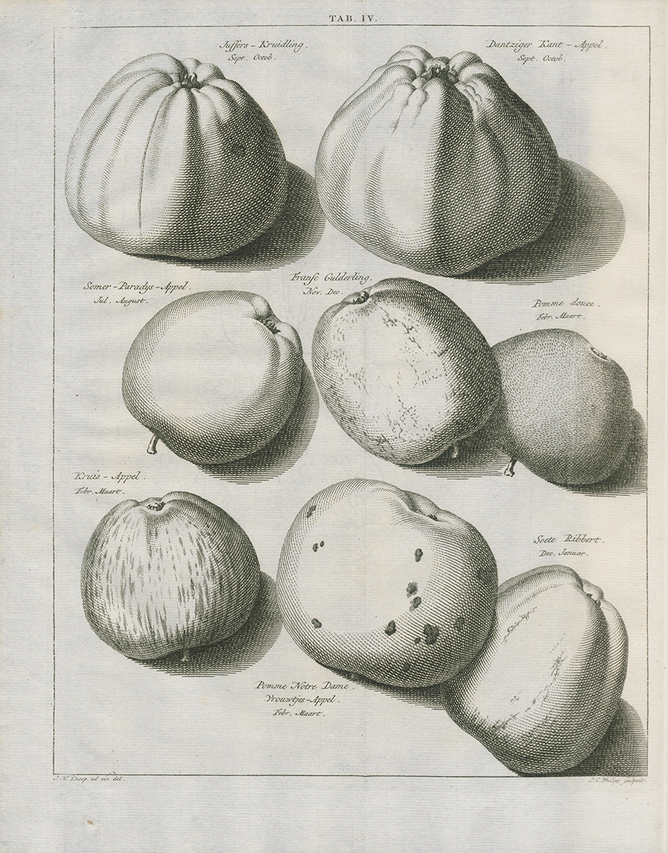 Johann Hermann Knoop: Pomologie, Ou Description Des Meilleures Sortes De Pommes Et De Poires, Que l'on estime & cultive le plus, soit aux Pais-Bas, soit en Allemagne, en France, en Angleterre, etc. Amsterdam 1771. Tab. 4. Dauerleihgabe Regensburgische Botanische Gesellschaft. Universitätsbibliothek Regensburg. (Tab.4)