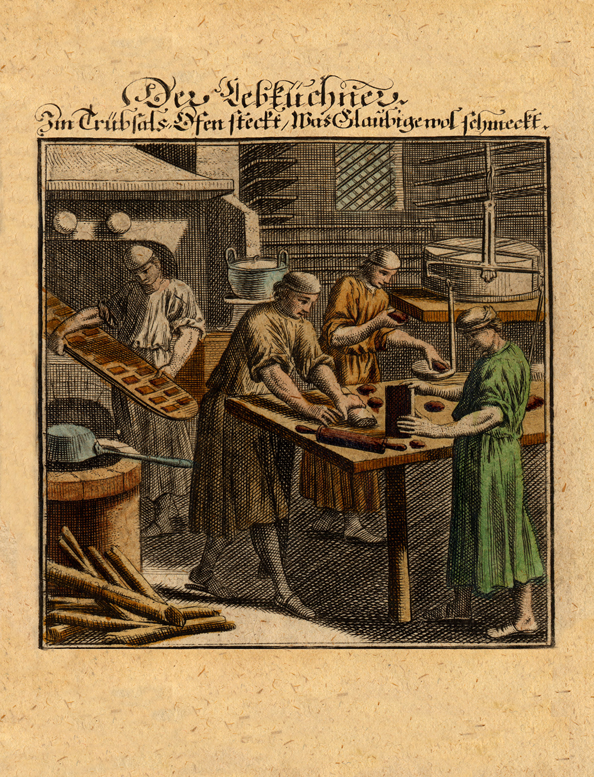 Aus: Christoph Weigel der Ältere: Abbildung Der Gemein-Nützlichen Haupt-Stände Von denen Regenten Und ihren So in Friedens- als Kriegs-Zeiten zugeordneten Bedienten an, biß auf alle Künstler Und Handwercker. Nach Jedes Ambts- und Beruffs-Verrichtungen, meist nach dem Leben gezeichnet und in Kupfer gebracht, auch nach Dero Ursprung, Nutzbar- und Denckwürdigkeiten, kurtz, doch gründlich beschrieben, und ganz neu an den Tag geleget. Regenspurg 1698. XX. Abtheilung. Nr. XI. Nach S. 514. „Der Lebküchner“. Universitätsbibliothek Regensburg.