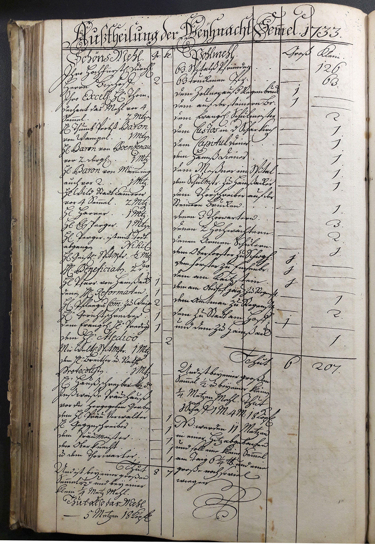 Eine ganze Spalte des Küchenbuchs widmet sich akribisch der Dokumentation, wie die Weihnachtssemmel nach Empfänger und Abgabemenge am Heiligen Abend zu verteilen sei. Als Erster führt der Regensburger Bischof die Liste mit zwei ganzen Semmeln an, ihm folgt der Domdekan mit einer 1¼ großen und 12 kleinen Semmeln. Weitere katholische wie evangelische Seelsorger, Handwerker und Bedienstete des Spitals vervollständigen die Aufstellung mit abnehmender Ration. Nicht eine primär religiös motivierte Gabe, sondern eine spezielle Verbundenheit der Beschenkten zum Katharinenspital bestimmte diese mehr gewohnheits- als pflichtmäßigen Naturalabgaben im Sinne einer Gratifikation. Der Kreis der Empfänger ersteckte sich somit von den höchsten geistlichen Herren bis zur Köchin des Spitals.