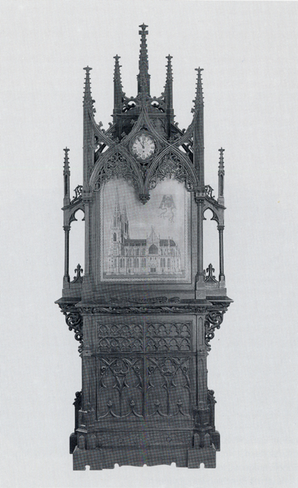 Ernst Langlotz: Schreibschrank mit eingebauter Uhr. Regensburg 1885. Museen der Stadt Regensburg. Die intarsierte Tür zeigt den Regensburger Dom. Auf der Innenseite der Tür ist das Innere des Doms dargestellt.