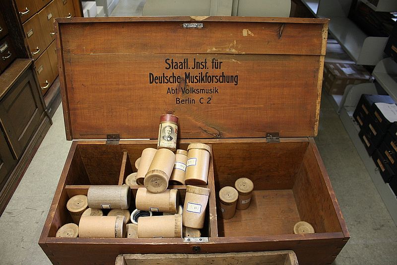 Teil der Phonogrammsammlung der Abteilung Volksmusik des Staatlichen Instituts für Deutsche Musikforschung, Berlin. In dieser Transportkiste waren die Phonogramme (Galvanos und Hartgusskopien) von 1943 bis 2009 verstaut.