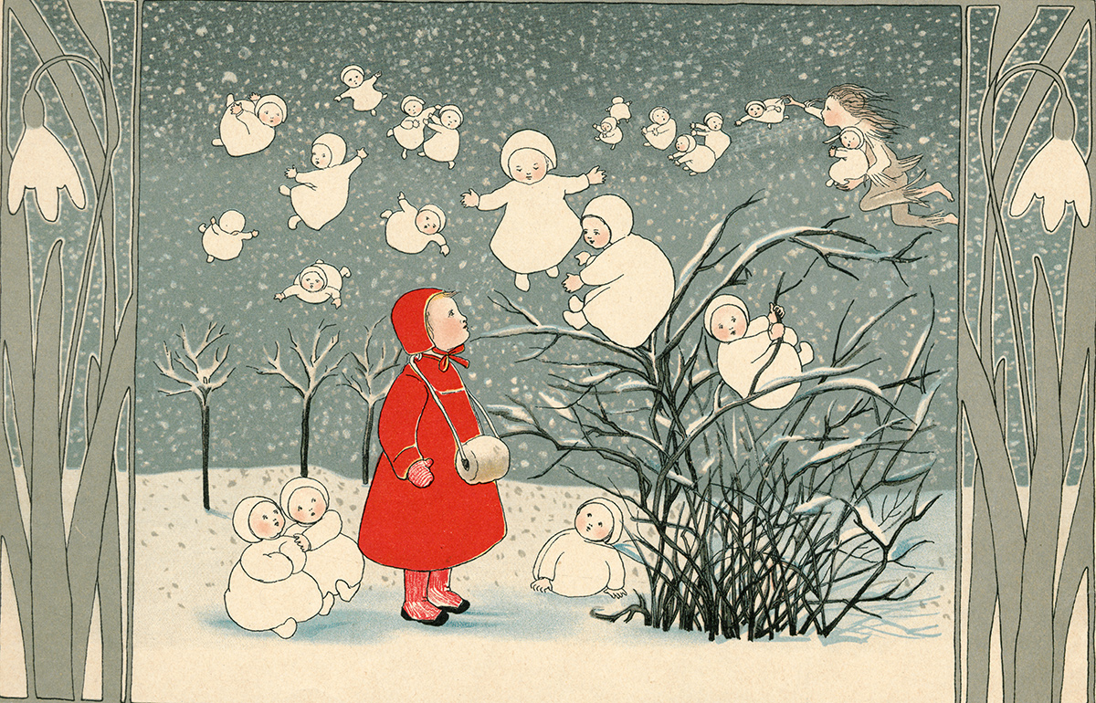 Die schönsten Schneeflocken haben wir in dem Kinderbuch „Was Marilenchen erlebte!“ von Sibylle von Olfers aus dem Jahr 1905 entdeckt: Weiß gekleidete Kinder purzeln als Schneeflocken vom Himmel und entführen Marilenchen in ihre Welt aus Eis und Schnee. Dieses Jugendstilmotiv soll unsere Weihnachtskarte zieren, die von einem Flyer zum Thema „Schnee – Transformationen und Reflexionen“ begleitet wird.
