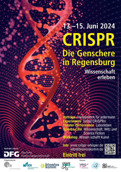 Die Genschere hat die Wissenschaft revolutioniert, wird aber auch kontrovers diskutiert. Erste Anwendungen gibt es bereits in der Medizin und weitere sind in Landwirtschaft und Materialforschung in der Pipeline. Die Universität und das Universitätsklinikum Regensburg veranstalten vom 13. bis 15. Juni 2024 gemeinsam mit dem Unternehmen BioWissKomm eine Roadshow mit einem facettenreichen Programm in dem sowohl Zukunftsaussichten als auch eventuelle Risiken und ethische Bedenken diskutiert werden.