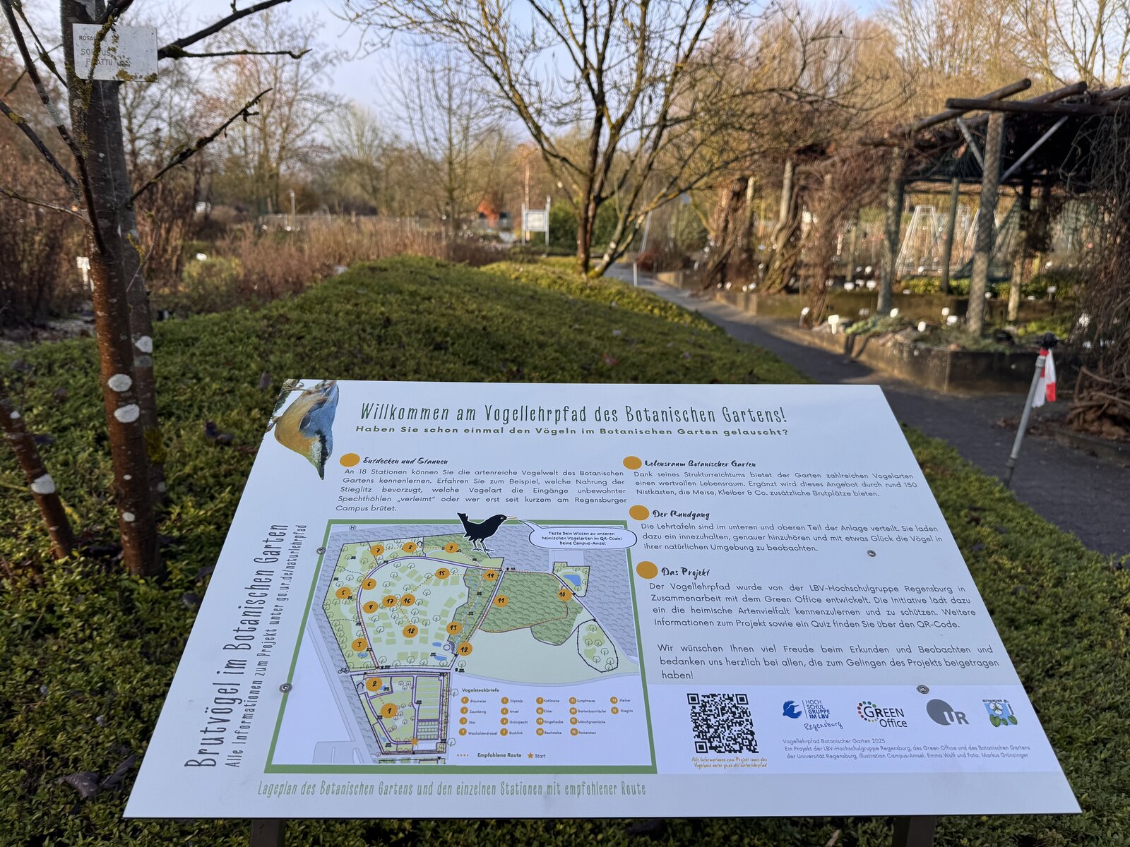 Im Laufe des Jahres 2025 wurden vorhandene Nistkästen überprüft, geeignete Standorte ausgewählt und schließlich 18 regelmäßig im Botanischen Garten beobachtete Vogelarten ausgewählt. Studierende der LBV-Hochschulgruppe erstellten zu jeder Art ein kurzes Portrait und gestalteten die neuen Informationstafeln. Unter den vorgestellten Arten befindet sich beispielsweise die Wacholderdrossel, die erst seit wenigen Jahrzehnten im Raum Regensburg brütet.