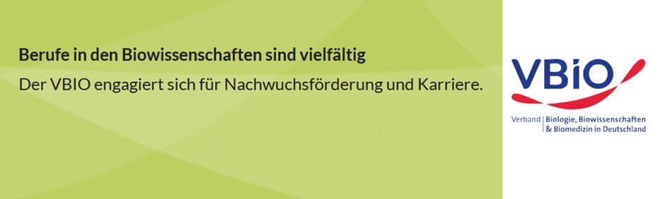 Der Verband Biologie, biowissenschaften & Biomedizin in Deutschland (VBiO) engagiert sich ebenfalls unter anderem in der Nachwuchs- und Karriereförderung in den Biowissenschaften. Auf der Webseite des Verbands: https://www.vbio.de/ausbildung-beruf/karriere-1 (externer Link, öffnet neues Fenster) finden sich viele Links und Informationen zur Berufsfindung sowie zu Job-, Firmenkontakt- und Absolventenmessen.