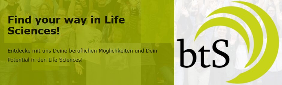Die „Life Sciences Studierendeninitiative - btS e.V." bietet Informationen zu Karriereoptionen und Berufsorientierung. Studierende und Promovierende aus allen Bereichen der Life Sciences unterstützen ehrenamtlich ihre Kommiliton:innen bei der Orientierung auf dem Karriereweg vom ersten Semester bis zum Berufseinstieg und organisieren unter dazu verschiedene Workshops, Karrieremessen (SciCon) sowie ein Life Sciences Karrierematching-Portal (Sci-Match). Alle Inforamtionen dazu finden Sie unter folgendem Link: https://bts-ev.de (externer Link, öffnet neues Fenster).