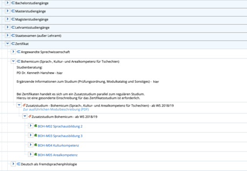 Hier die Module der gültigen Prüfungsordnung für das Zusatzstudium "Bohemicum (Sprach-, Kultur- und Arealkompetenz für Tschechien)" an der Universität Regensburg vom 8. Februar 2019