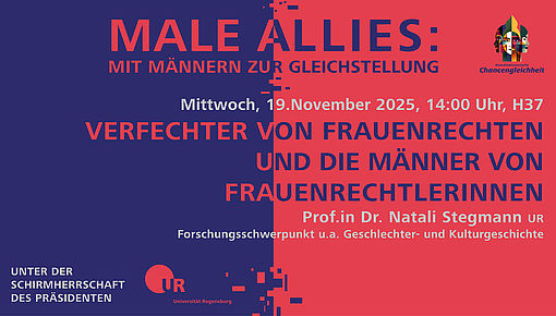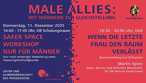 Auf unseren Seiten finden Sie Informationen zu Themen rund um Gleichstellung, Geschlechtergerechtigkeit und Chancengleichheit, insbesondere zu Angeboten, Ansprechpartner:innen, Unterstützung und Förderung von Wissenschaftlerinnen und Studierenden an der Universität Regensburg