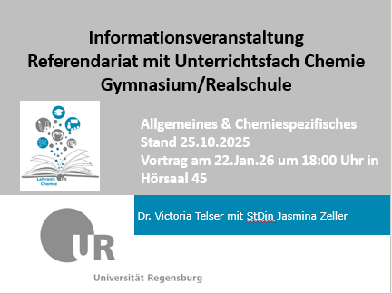 Die Chemiedidaktik bietet immer gegen Ende der Vorlesungszeit des Wintersemesters eine Informationsveranstaltung mit allgemeinen und chemiespezifischen Informationen an.