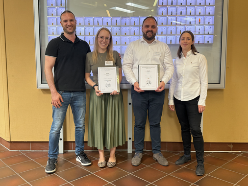 Die Preisträger*innen Sophia Horina (2. v. l.) und Fabian Jäger (2. v. r.) mit den Betreuer*innen Sebastian Rohr (l.) und Dr. Victoria Telser (r.)