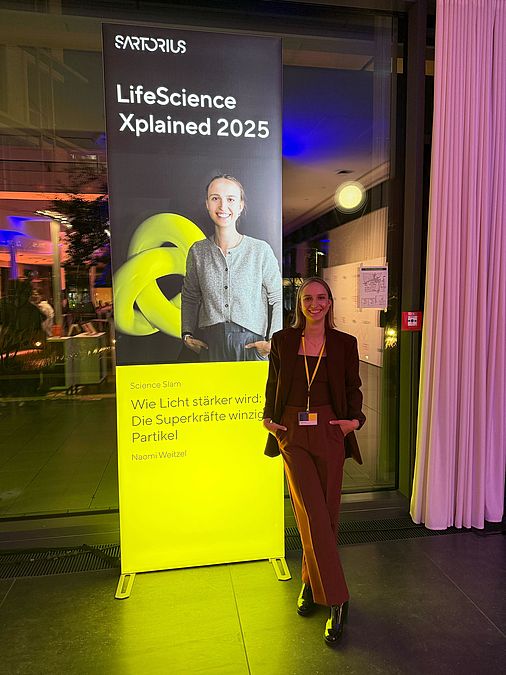 In her three-minute science slam “How Light Becomes Stronger: The Superpower of Tiny Particles”, Naomi explained how rare-earth nanoparticles can convert low-energy infrared light into higher-energy blue or UV light. This process could one day be used to target cancer cells in a gentler and more precise way.