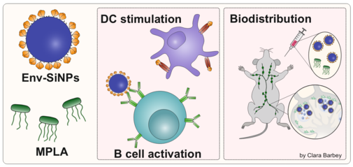 Delivery of antigens to draining lymph nodes is essential for a potent HIV vaccine. Therefore, we use silica nanoparticles (SiNPs) as delivery platform for the multimeric presentation of HIV´s Envelope (Env) immunogen. We optimize the site-specific coupling reaction to achieve virus-mimetic nanoparticles that are physico-chemically characterized regarding size, zeta potential and functionality of the antigen. The multivalent antigen presentation leads to an increased avidity to B cell receptors followed by a higher B cell activation. Together with our partners from the HIVacToGC consortium we also investigate the kinetics of Env delivery to the lymph nodes in vivo.