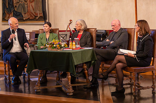 Die Podiumsdiskussion fand mit (v.li.) Prof. Dr. Guido Hausmann, Tanja Maljartschuk, Cathrin Kahlweit, Ralf Fücks und Prof. Dr. Mirja Lecke statt. © Uwe Moosburger, www.altrofoto.de