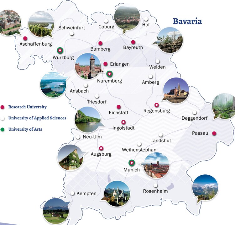 With its universities, universities of applied sciences, art and music academies, Bavaria offers a wide range of modern and innovative study programs. In the 2024/2025 winter semester alone, a total of 3,086 degree programs were offered, including 1,200 bachelor's degrees, 1,282 master's degrees, and 571 state and church degrees (source (external link, opens in a new window)).