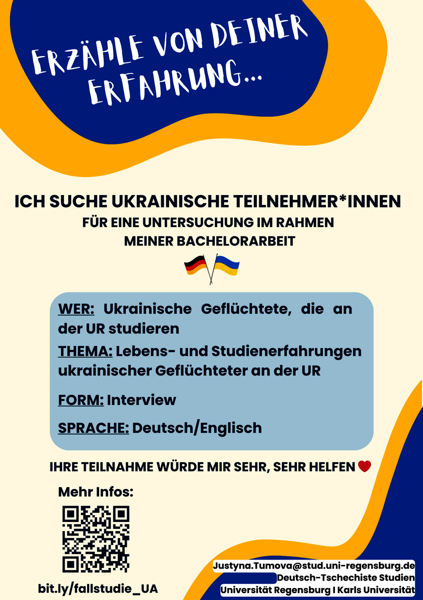 We are looking for Ukrainians who are studying at the University of Regensburg and who would like to talk about their life and study experiences as refugees in Regensburg for a bachelor's thesis.