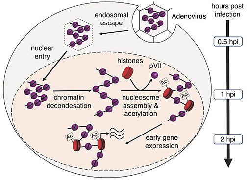 The scientist could show that in the virus, the viral DNA is tightly wrapped around the viral pVII protein. This unique conformation facilitates seamless accommodation of the genome within the confined viral capsid. Once viruses entered the cell, the packaged viral DNA completes its journey to the nucleus in approximately 30 minutes. Following capsid release and nuclear import parts of the viral genome alter the transport configuration and open up. During this process, a few pVII proteins are specifically removed and replaced by cellular histone proteins at the regulatory sites of early activated viral genes. This strategic exchange with histone proteins unlocks the potential for the viral genetic information to hijack the cellular transcription machinery, enabling efficient gene expression – a process that starts around thirty minutes after the genome arrives in the nucleus, culminating in cell infection.