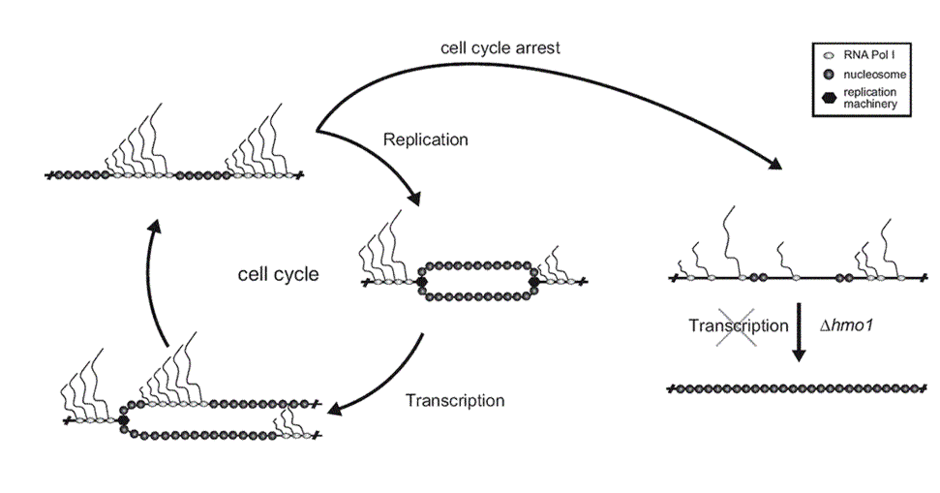 A fascinating aspect of our research is the existence of two populations of 35S rRNA genes: actively transcribed genes and transcriptionally inactive genes that adopt distinct chromatin structures. While actively transcribed rRNA genes are largely devoid of nucleosomes and bound by the HMG-box protein Hmo1, maintaining a fraction of inactive 35S rRNA genes is crucial for genomic stability under certain conditions.