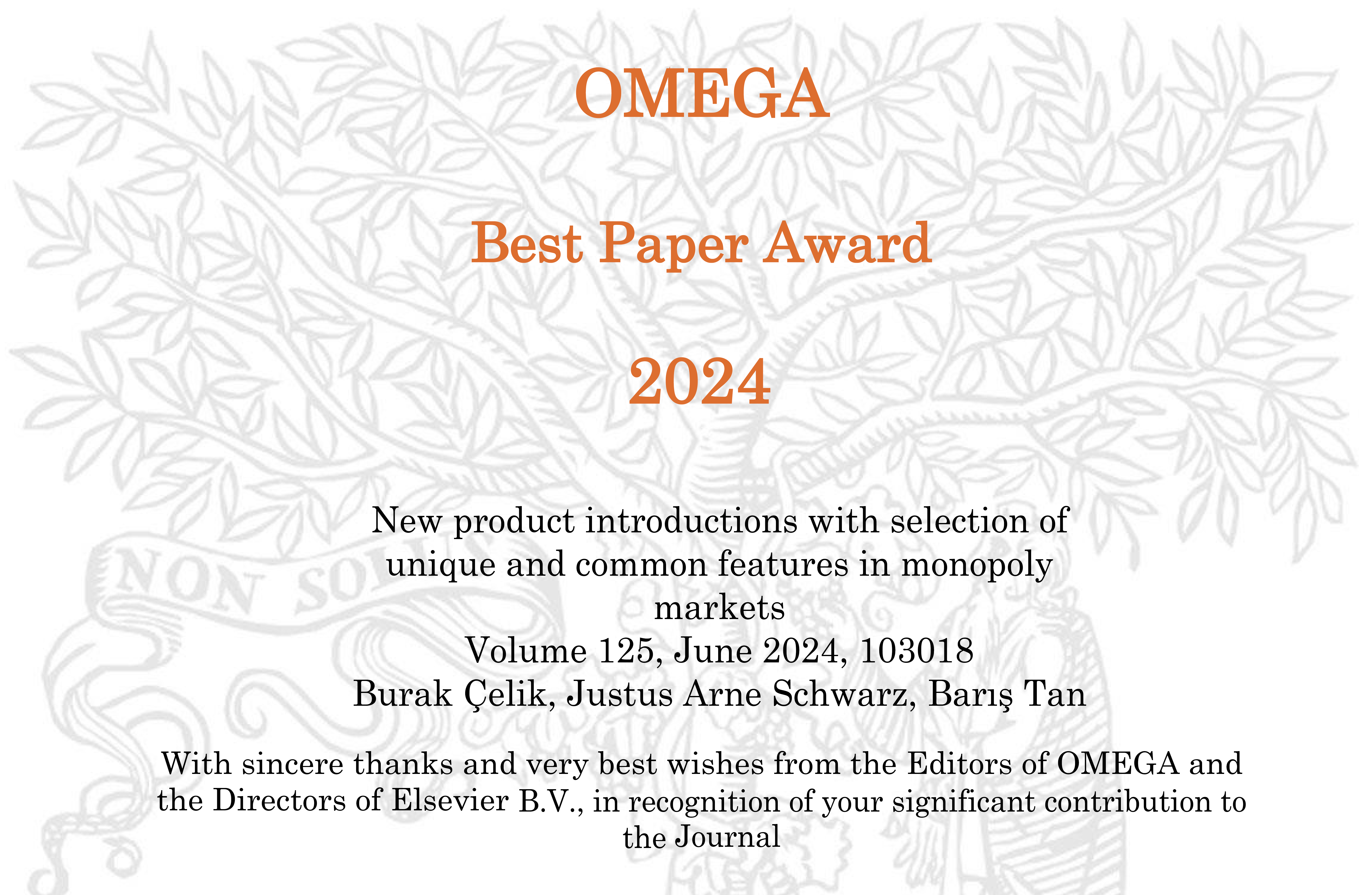 The latest research by Prof. Dr. Justus Arne Schwarz, in collaboration with colleagues from Koç University and Özyeğin University in Istanbul, has been honored with the 2024 Best Paper Award by Omega: The International Journal of Management Science. The award-winning article, titled "New Product Introductions with Selection of Unique and Common Features in Monopoly Markets", offers insights into product design, production decisions for product rollovers.