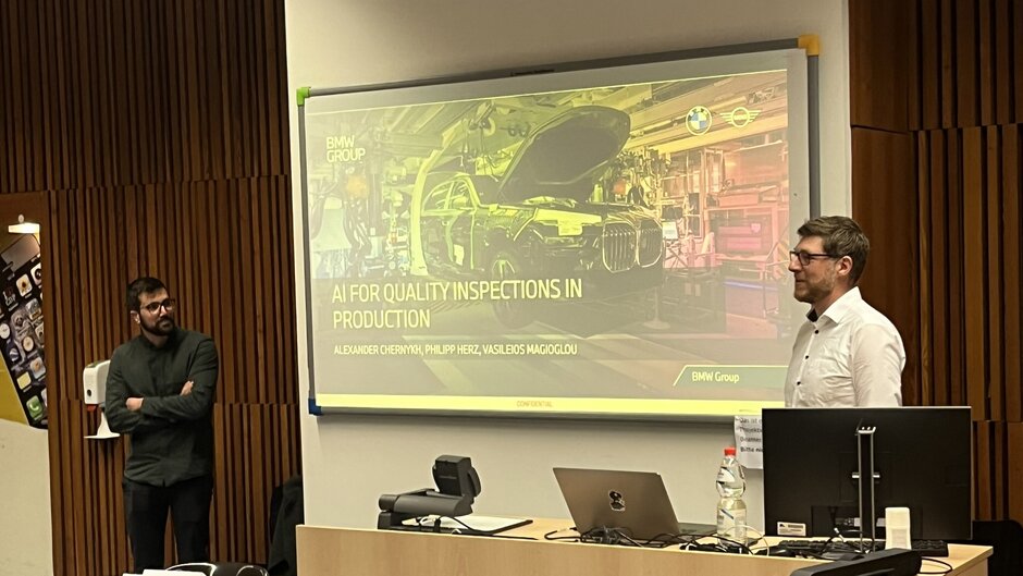 During the session, students gained insights into the diverse applications of artificial intelligence in manufacturing processes, particularly for ensuring product quality. Philipp Herz and his team shared practical examples from BMW's production environment, showcasing how AI-driven solutions are employed to detect defects and enhance overall efficiency. In addition, real-world challenges encountered during implementation, including data quality and scaling of AI projects, were discussed.