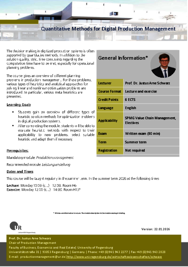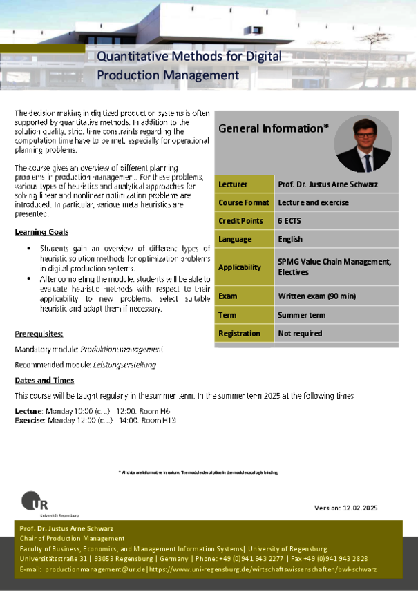 The course gives an overview of different planning problems in production management. For these problems, various types of heuristics and analytical approaches for solving linear and nonlinear optimization problems are introduced. In particular, various meta-heuristics are presented.