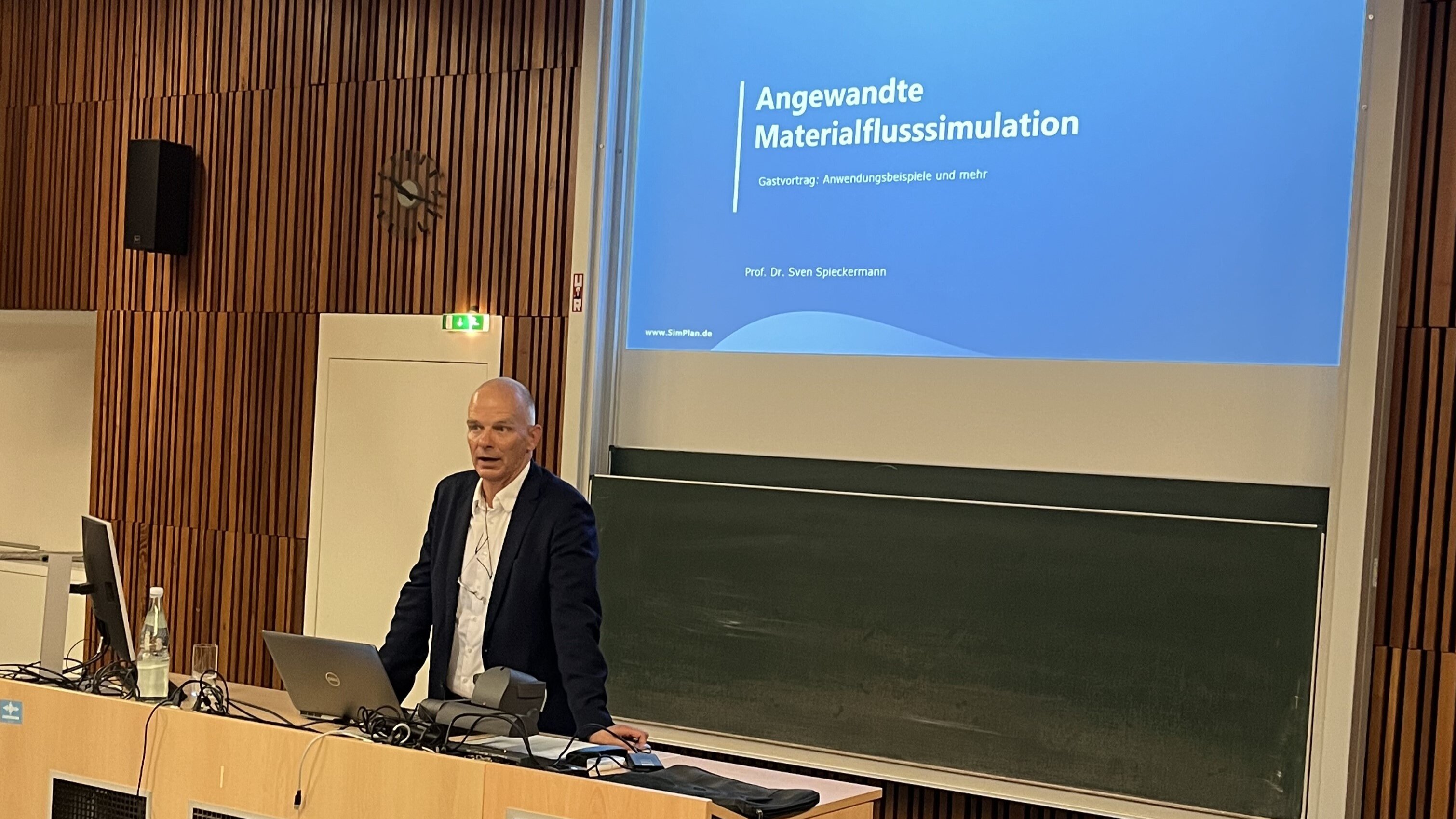 Prof. Dr. Spieckermann gave an exciting lecture that provided insights into discrete-event simulation, digital twins and Industry 4.0. The students on the "Simulation of Production Systems" course learned interesting facts about various use cases, the associated software, basic concepts, and the market for discrete-event simulation.
