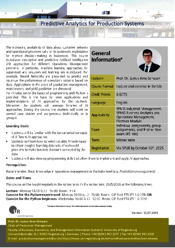 This course introduces descriptive and predictive Artificial Intelligence (AI) approaches for different Operations Management problems. In particular, machine learning approaches for unsupervised and supervised learning are introduced. For example, Neural Networks are presented to predict and optimize the performance of operations systems based on data. Applications in the areas of production management, maintenance, and yield prediction are discussed.