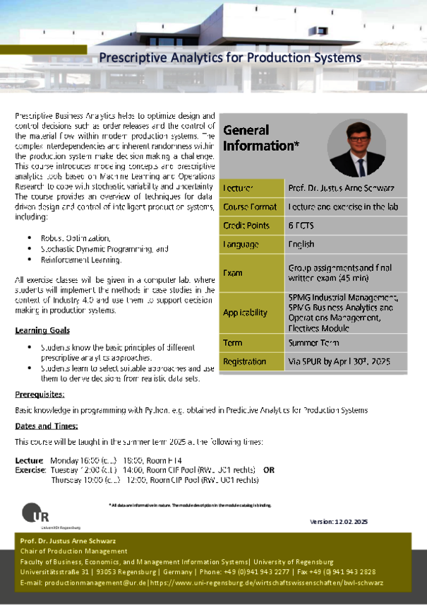 The course provides an overview of various prescriptive techniques for data-driven design and control of intelligent production systems, including: