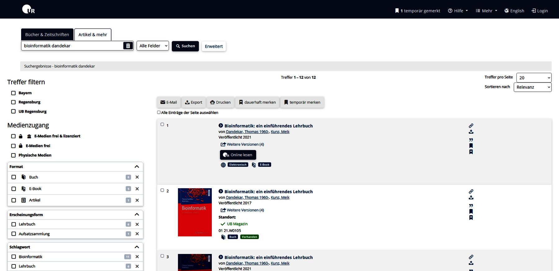 In the Library Catalog (external link, opens in a new window) the tab „Books & Journals“ contains printed books, e-books and other media held at the University Library of Regensburg and other Bavarian libraries.