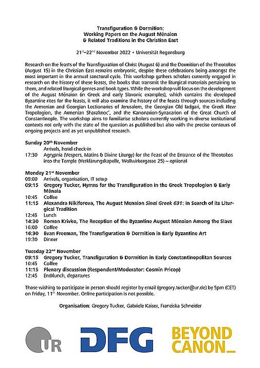 Research on the feasts of the Transfiguration of Christ (August 6) and the Dormition of the Theotokos (August 15) in the Christian East remains embryonic, despite these celebrations being amongst the most important in the annual sanctoral cycle. This workshop gathers scholars currently engaged in research on the history of these feasts, the books that transmit the liturgical materials pertaining to them, and related liturgical genres and book types. While the workshop will focus on the development of the August Mēnaion (in Greek and early Slavonic examples), which contains the developed Byzantine rites for the feasts, it will also examine the history of the feasts through sources including the Armenian and Georgian Lectionaries of Jerusalem, the Georgian Old Iadgari, the Greek New Tropologion, the Armenian Sharaknoc’, and the Kanonarion-Synaxarion of the Great Church of Constantinople. The workshop aims to familiarise scholars currently working in diverse institutional contexts not only with the state of the question aspublished but also with the precise contours of ongoing projects and as yet unpublished research.