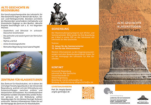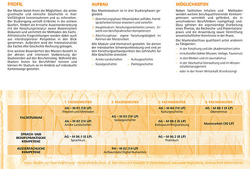 Weitere Informationen entnehmen Sie bitte dem hier eingestellten Flyer oder der Homepage: https://www.uni-regensburg.de/philosophie-kunst-geschichte-gesellschaft/alte-geschichte/studium/studiengaenge-und-abschluesse/m-a-alte-geschichte-klassikstudien/