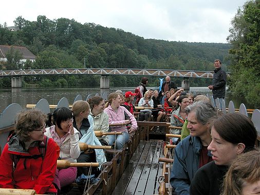 Schon nach den ersten Testfahrten mit der Regina war klar, dass ein Fahrzeug dieser Bauart nicht unbedingt einer Besatzung von professionellen Ruderern bedurfte, sondern – nach kurzer Einweisungsphase - auch von gewöhnlichen Soldaten effizient betrieben werden konnten. Dies eröffnete weitere Perspektiven für die Nutzung der nachgebauten Navis Lusoria. Dank der idealen hydrologischen Verhältnisse auf der naturbelassenen Unteren Naab (keine Strömung, kein gewerblicher Schiffsverkehr) konnte ein erlebnispädagogisch hochwertiges Konzept zum außerschulischen Unterricht geschaffen werden. Komplette Schulklassen (Abb. 1) und natürlich auch weitere Gruppen interessierter Laien können nun schon seit Jahren nicht allein in einem im höchsten Maße positiven gruppendynamischen Prozess aktiv in die Praxis der antiken Flussschifffahrt eintauchen. Sie dürfen in einer spannend aufgezogenen Lehreinheit nicht nur ihr Können und ihre Kraft als antike remiges unter Beweis stellen, sondern gewinnen damit auch unmittelbaren Einblick in den harten Arbeitsalltag der römischen Grenzsoldaten. Unterstützt wird dieser Vorgang durch eine umfassende Betreuung seitens einer Begleitmannschaft, die in Kurzvorträgen während der Fahrt auch weitere interessante historische und technologische Aspekte zu vermitteln trachtet (Abb. 2).