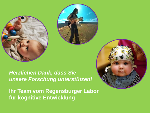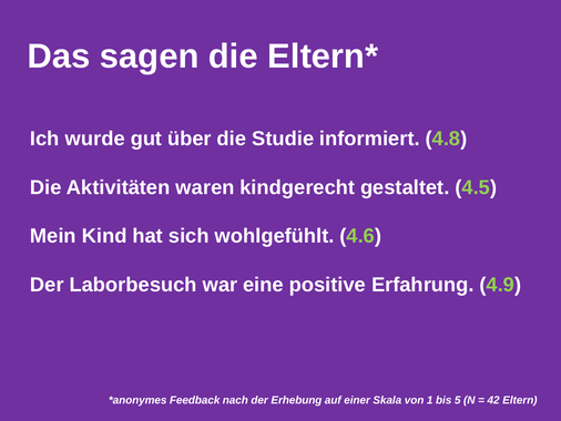 Wir stellen im Rahmen unserer Forschungsprojekte keine klinischen Diagnosen. Bitte haben Sie Verständnis, dass wir Ihnen daher keine individuelle Rückmeldung zur Entwicklung Ihres Kindes geben können. Für Informationen zu unseren Forschungsergebnissen melden Sie sich gerne für unseren Newsletter an, um einmal jährlich über die aktuellen Befunde aus den Entwicklungslabor informiert zu werden. (Für den Newsletter können Sie sich bei der Anmeldung Ihres Kindes registrieren oder indem Sie uns eine Mail an entwicklungsstudien@uni-regensburg.de senden.)