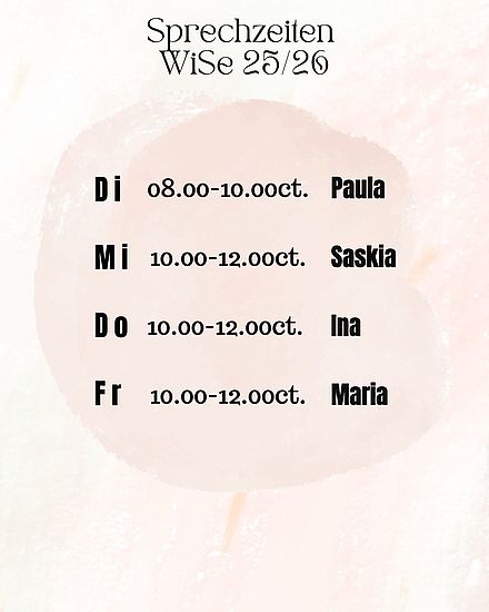 Zu diesen Zeiten sind wir für euch da und ihr könnt unangemeldet bei uns im Zimmer PT 4.0.5 vorbeischauen.