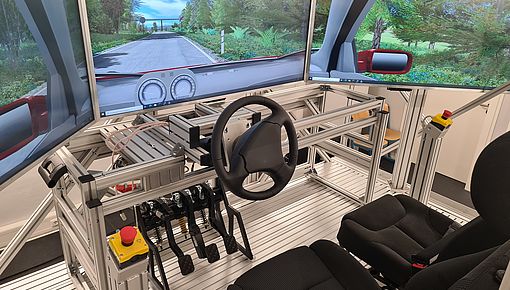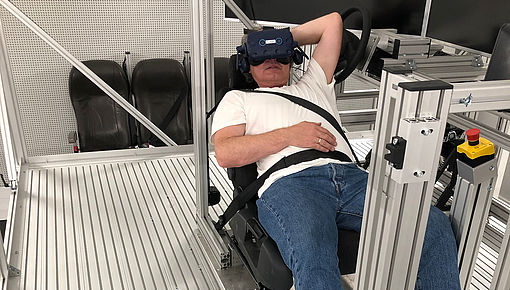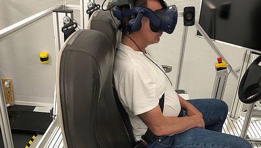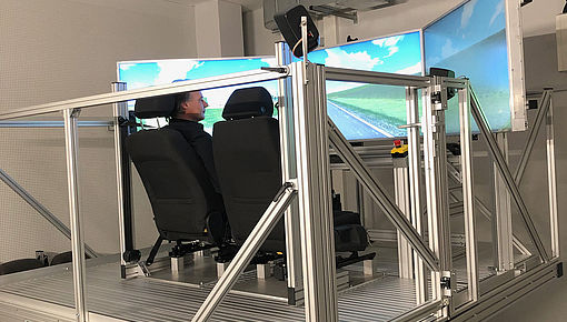 Dieses Labor ermöglicht die Simulation von kontrollierten passiven Eigenbewegungen in Virtueller Realität. Hierfür sitzt oder liegt der Proband oder die Probandin in einem Sitz auf einer Bewegungsplattform mit 6 Freiheitsgraden (siehe Abbildung. Specs: +-0.6m horizontal, +-0.4m vertikal, ca. +-29 Grad roll, pitch, yaw). Auf der Plattform können sowohl Flugzeugsitze (eine Dreierreihe) als auch Autositze (Fahrer und Beifahrer) montiert und benutzt werden. Die visuelle Präsentation erfolgt entweder über ein Head-Mounted Display oder 3 große auf der Plattform montierte Monitore (100Grad horizontal). Dadurch können multimodale Simulationen mit Stimulation des Gleichgewichtssinns realisiert werden. Als Simulationsumgebungen stehen SILAB und Cybersession sowie Graphik-Engines wie UnReal zur Verfügung. Währen der Simulation können EEG, peripher-physiologische Reaktionen sowie Körper- und Augenbewegungen mittels Eye-Tracking erfasst werden. Neben dem Selbstbericht stehen also Verhalten und physiologische sowie neuronale Reaktionen als Messgrößen zur Verfügung. Das Labor dient zur Untersuchung von angewandten Fragestellungen in der Klinischen Psychologie und Psychotherapie sowie von grundlegenden Prozesse bei Angst und den Wirkmechanismen bei der Psychotherapie von Angststörungen (z.B. Flugphobie, Posttraumatische Belastungsstörung nach Autounfällen). Außerdem können auch grundlegende Fragen der Allgemeinen und Biologischen Psychologie wie multimodale Wahrnehmungsprozesse unter Einbezug der Eigenbewegung mittel innovativen und ökologisch validen Paradigmen sowie Fragestellung der Ergonomie z.B. bezüglich Eigenschaften von Automobilen untersucht werden. Das Gerät kann von Arbeitsgruppen der Universität Regensburg sowie von externen Forschenden genutzt werden. Bei Interesse nehmen sie bitte mit dem Lehrstuhl Kontakt auf.