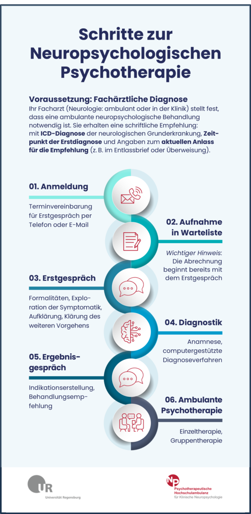 Ziel: Während der Sprechstunde wird abgeklärt, ob eine neuropsychologische Erkrankung vorliegt und eine neuropsychologische Psychotherapie indiziert ist und welche weiteren Hilfsmaßnahmen geeignet sind. Wenn eine ambulante neuropsychologische Psychotherapie indiziert ist, freie Plätze vorhanden sind und daran Interesse besteht, kann im Anschluss bei uns eine ambulante Lehr- oder Forschungspsychotherapie begonnen werden.