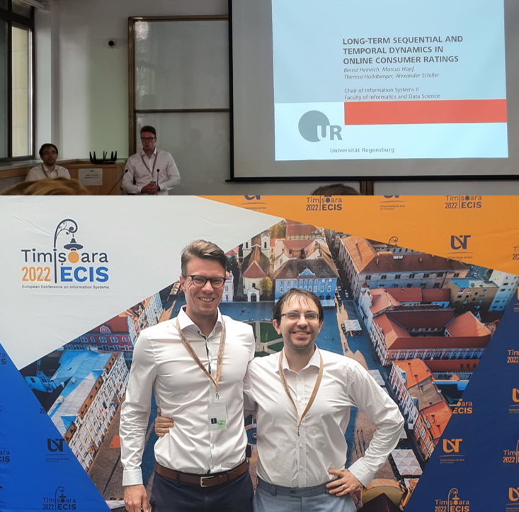 Ihre erfolgreiche Forschungsarbeit am Lehrstuhl für Wirtschaftsinformatik II konnten Dr. Alexander Schiller und Marcus Hopf auf der 30th European Conference on Information Systems in Timisoara, Rumänien (ECIS2022) präsentieren. Der Beitrag „Long-Term Sequential and Temporal Dynamics in Online Consumer Ratings“ wurde von Prof. Dr. Bernd Heinrich, Marcus Hopf, Theresa Hollnberger und Dr. Alexander Schiller an der Universität Regensburg verfasst. Im Anschluss an den Vortrag gab es einen regen und fruchtvollen Austausch mit dem internationalen Fachpublikum.