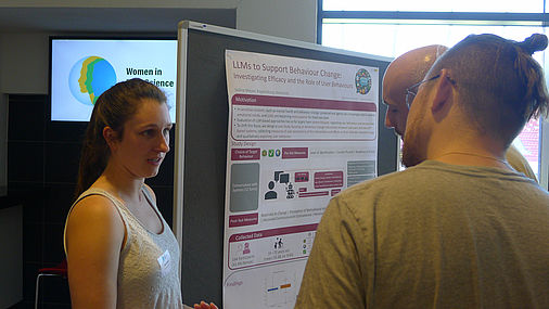 Prof. Dr. Udo Kruschwitz, Inhaber des Lehrstuhls für Informationswissenschaft an der Universität Regensburg und einer der Mitorganisatoren der Konferenz, hebt hervor, dass insbesondere die neue Fakultät für Informatik und Data Science (externer Link, öffnet neues Fenster)(FIDS) sehr präsent war, und zwar sowohl bei der Präsentation von Postern als auch als starke Kohorte im Publikum. Kruschwitz dazu: „Das ist Wissenstransfer in Aktion. Was könnte es Schöneres in der Lehre geben, als die Grundlagen der maschinellen Sprachverarbeitung zu unterrichten und tags darauf die gleichen Studentinnen und Studenten zu erleben, wie sie begeistert Fragen an die Expertinnen richten, die aus erster Hand von den praktischen Anwendungen berichten.” Bei den Postern waren unter anderem Pia Donabauer (Bachelorstudentin der Informationswissenschaft) und Selina Meyer (Doktorandin) am Start.