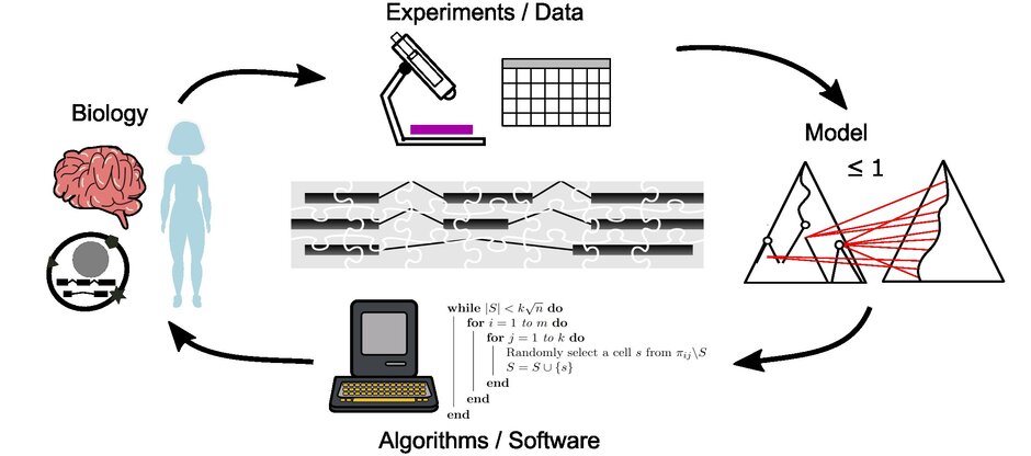 Für die Entwicklung genauer und effizienter computergestützter Methoden kombinieren wir Techniken aus der kombinatorischen Optimierung und dem maschinellen Lernen. So haben wir beispielsweise exakte und approximative Algorithmen für ein Graphfärbungsproblem entwickelt, um die Auflösung experimenteller Proteinstrukturdaten zu verbessern, neuronale Netzwerke eingesetzt, um hochdimensionale zelluläre Messdaten in einen interpretierbaren niedrigdimensionalen Raum zu projizieren, und das dynamische Zeitverzerrungsverfahren erweitert, um komplexe Trajektorien – etwa von sich differenzierenden Immunzellen – zu vergleichen.