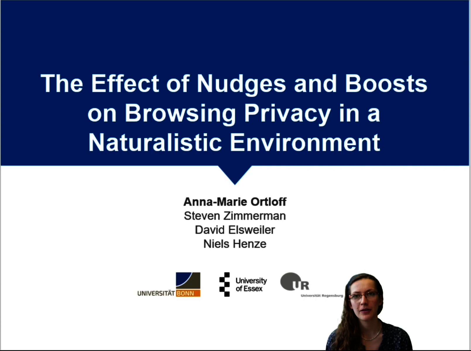 Anna-Marie Ortloff präsentierte das Paper "The Effect of Nudges and Boosts on Browsing Privacy in a Naturalistic Environment (externer Link, öffnet neues Fenster)" auf der CHIIR 2021, welches sich mit Möglichkeiten der Beeinflussung des Nutzerverhaltens bezüglich der Preisgabe persönlicher Daten beim Surfen im Internet beschäftigt. Die Veröffentlichung ist aus ihrer Masterarbeit enstanden – in Zusammenarbeit mit Steven Zimmerman, David Elsweiler und Niels Henze.