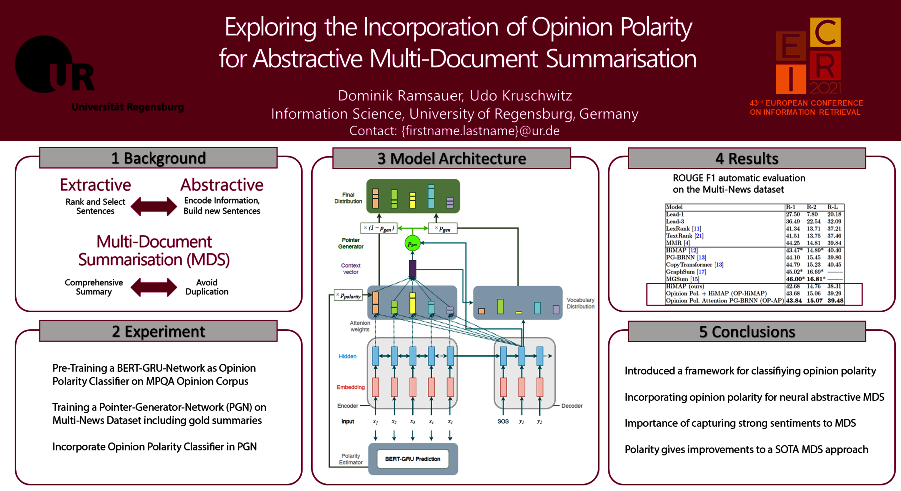 Auf der im Online-Format stattfindenden ECIR 2021 stellte Dominik Ramsauer ein Short Paper zum Thema "Exploring the Incorporation of Opinion Polarity for Abstractive Multi-document Summarisation" (externer Link, öffnet neues Fenster) vor. Darin erarbeitete er ein Modell für MDS, mit dem es möglich wird, auch Stimmungen und Meinungen innerhalb der abstrakt zusammengefassten Dokumente zu erhalten.