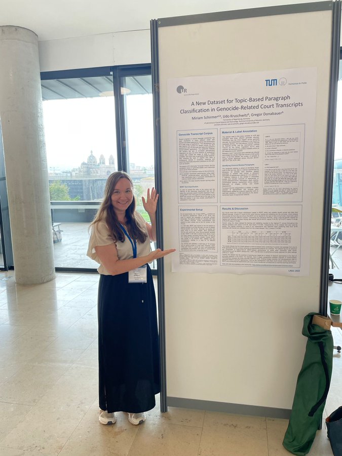 Miriam Schirmer veröffentlichte zusammen mit Gregor Donabauer und Udo Kruschwitz das Paper "A New Dataset for Topic-Based Paragraph Classification in Genocide-Related Court Transcripts (externer Link, öffnet neues Fenster)", welches für die LREC 2022 angenommen und zudem als Poster präsentiert wurde. Miriam Schirmer studierte im Master Kriminologie an der UR und besuchte eine Veranstaltung zum Natural Language Engineering, welche sie nachhaltig prägte. Gleichzeitig ist das Paper Teil ihrer Promotion im Bereich Computational Social Science an der TU München.
