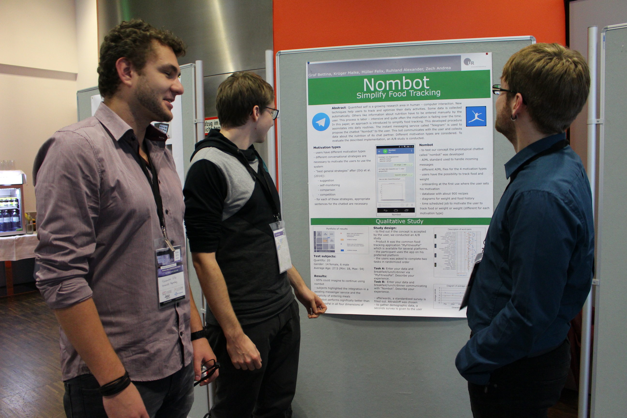 Ende 2015 präsentierten sechs Studentengruppen ihre Projekte zum Masterkurs "Algorithmen für Mensch-Maschine-Interaktion" auf der MUM’15 („International Conference on Mobile and Ubiquitous Multimedia“) in Linz. Erfreulicherweise stellten unsere Studenten auf dieser Veranstaltung sechs von insgesamt 15 akzeptierten Forschungsprojekten. Im Folgenden ein kurzer Überblick über die Projektarbeiten: