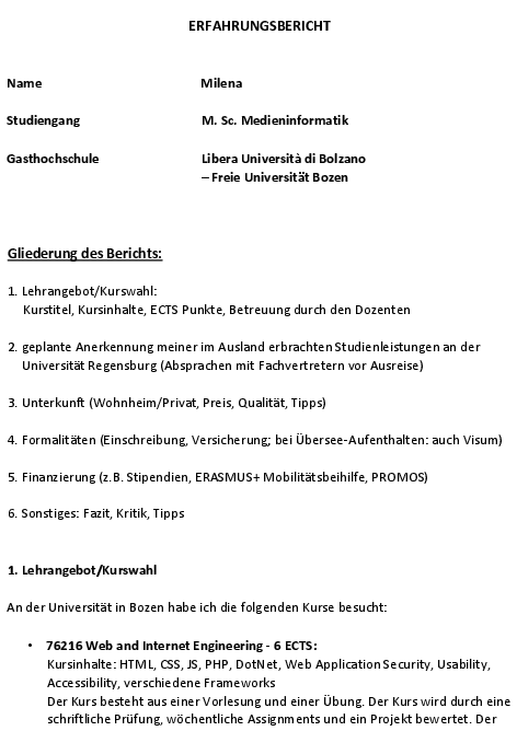 Da mir für mein Studium nur noch ein Kurs fehlte, sprach ich zuvor mit dem Modulverantwortlichen die Kursbelegung ab. Ich konnte mir so einen Kurs der Universität Bozen, der normalerweise 8 Credits gibt, für 12 Leistungspunkte an der Universität Regensburg anrechnen lassen.