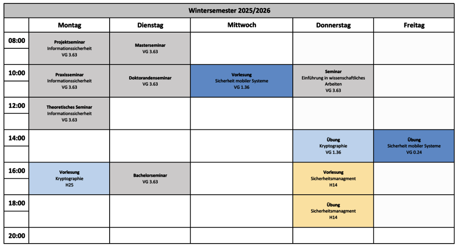 | Sicherheit mobiler Systeme | WiSe | DE | 2V+2Ü | 6 | → (externer Link, öffnet neues Fenster) | → (externer Link, öffnet neues Fenster) |