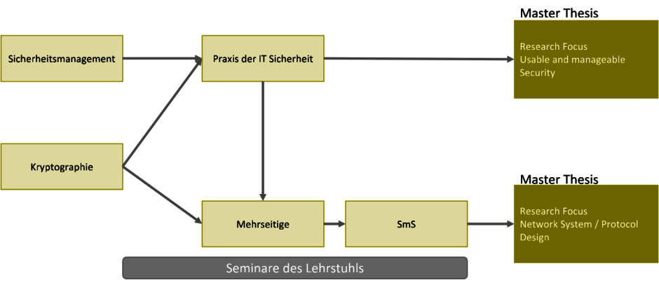 Der Lehrstuhl für Wirtschaftsinformatik IV forscht im Bereich der IT-Sicherheit an vielen interessanten Gebieten, die sich für eine Bachelor- oder Masterarbeit anbieten. Dazu gehören unter anderem mehrseitig sichere Systeme, Location Based Services und Anonymität im Internet.