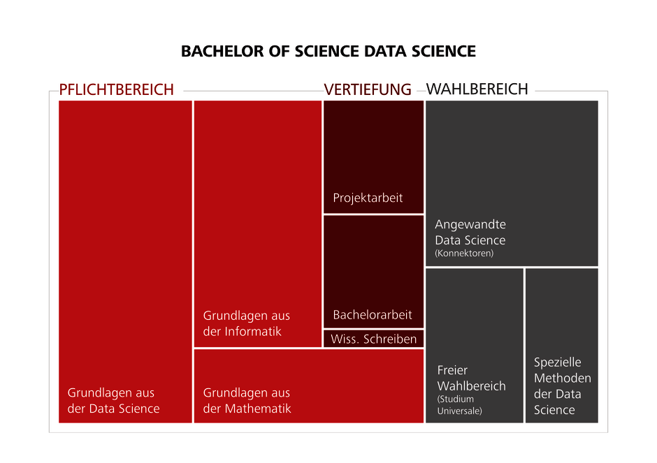 Der B.Sc. Data Science an der Universität Regensburg ist in einen Pflicht- und einen Wahlbereich untergliedert. Der Pflichtbereich lässt sich wiederum in einen Grundlagen- und einen Vertiefungsbereich unterteilen. Welchen Anteil einzelne Themengebiete bzw. Lernziele innerhalb dieser Bereiche haben, kannst Du dem folgenden Schaubild entnehmen: